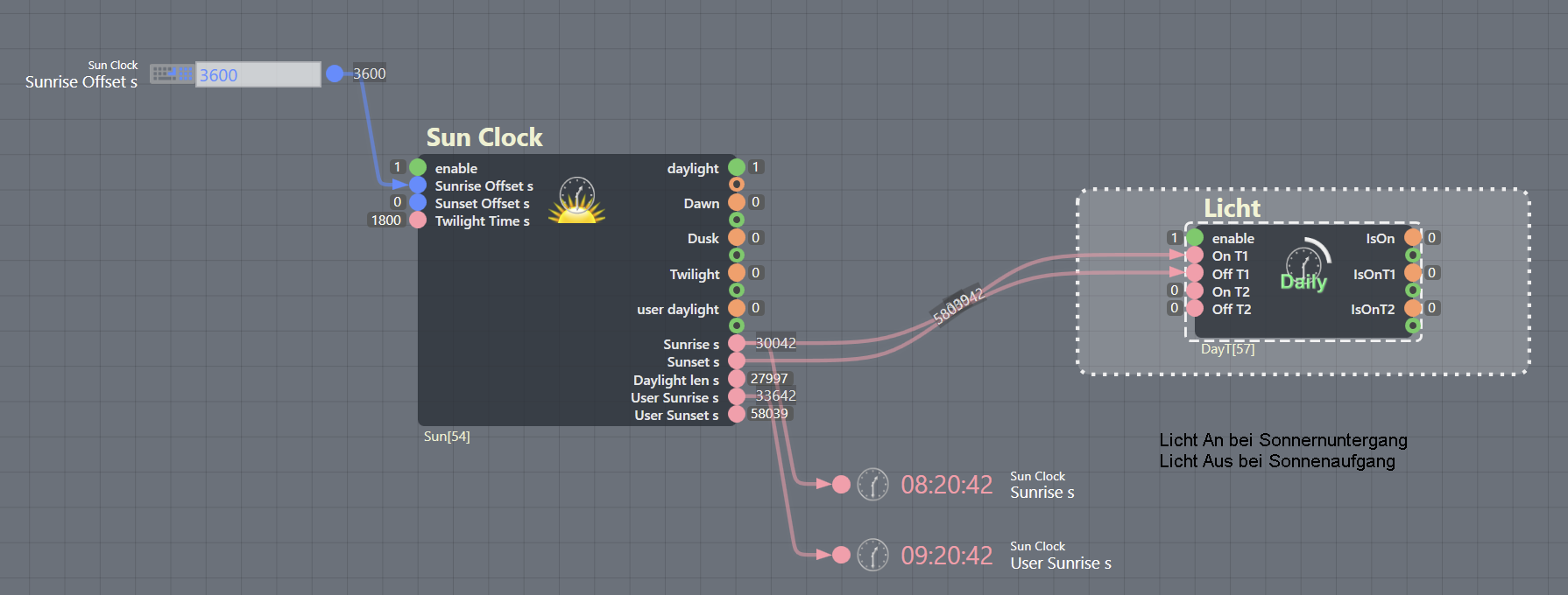 Mit dem “Sun Clock”-Block haben Sie die Möglichkeit, eine Zeitschaltuhr zu konfigurieren, die sich harmonisch am natürlichen Rhythmus von Sonnenaufgang und Sonnenuntergang orientiert.